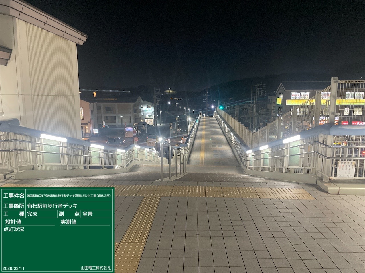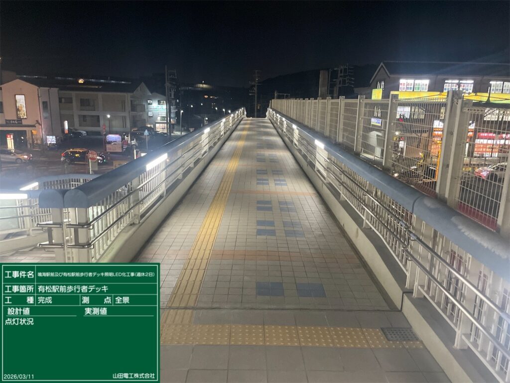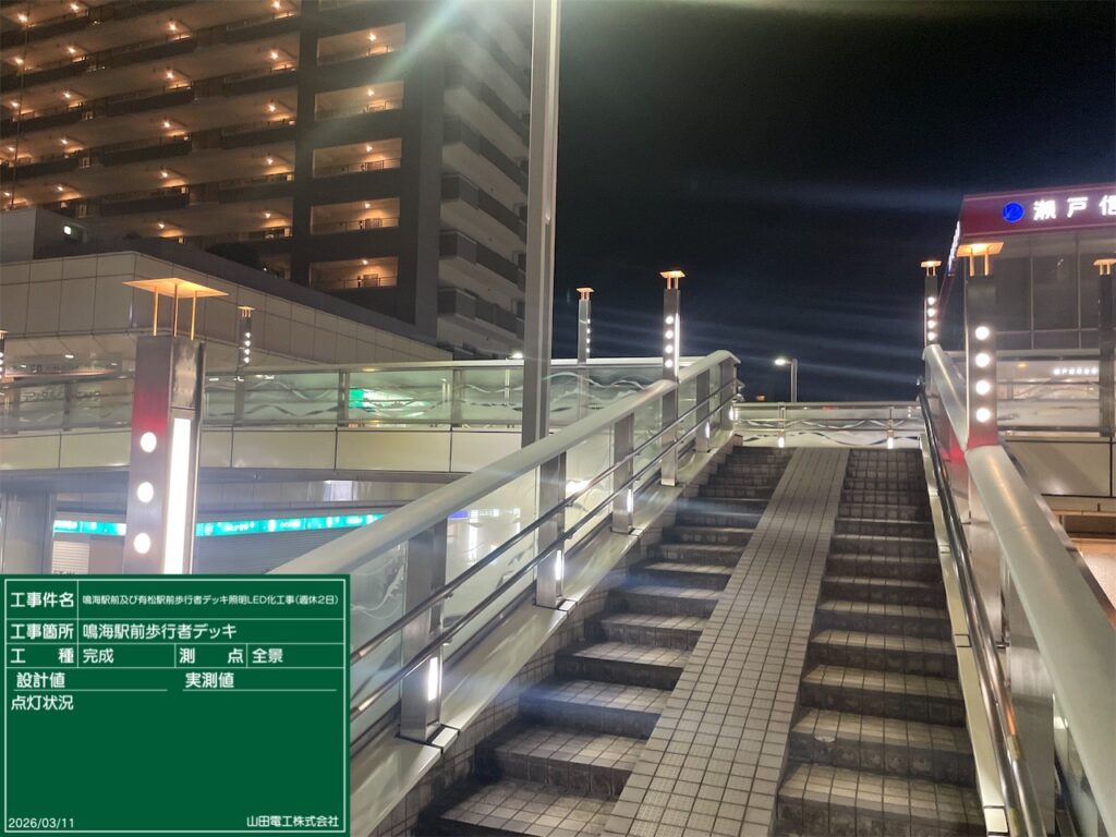 【名古屋市】歩行者デッキ照明LED化工事 2026 3/31 工事実績 2026年3月31日 所在地愛知県名古屋市緑区契約期間3カ月工事内容駅前歩行者デッキ照明のLED化工事施工体系元請け(公共工事) お問い合わせはコチラから 工事実績 電気工事 よかったらシェアしてね! URLをコピーしました! URLをコピーしました! 新メンバー募集(求人募集) 関連記事 【名古屋市】小規模付属物(道路照明)点検業務 2026年3月13日 【新城市】EV急速充電器新設工事 2026年3月3日 【名古屋市】道路照明工事 2026年2月27日 【いなべ市】工場の自家消費向け太陽光発電設備新設工事 2026年2月25日 【名古屋市】道路照明工事 2026年1月15日 【名古屋市】道路照明工事 2025年12月23日 【名古屋市】点検口新設工事 2025年5月22日 【徳島県】 PDCE(避雷針)工事 サッカーグランド 2025年5月22日